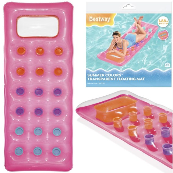 Materac do pływania firmy Bestway to idealne rozwiązanie na letni wypoczynek nad morzem, jeziorem w basenie czy we własnym ogrodzie. Dmuchany materac wykonany jest z wytrzymałego materiału PCV, który posłuży przez klika lat. Charakterystyczną cechą nadmuchiwanego materaca jest przezroczyste okienko w zagłówku, umożliwiające podziwianie podwodnego świata. Materac do pływania to wspaniała propozycja dla osób ceniących wygodę i relaks na świeżym powietrzu.