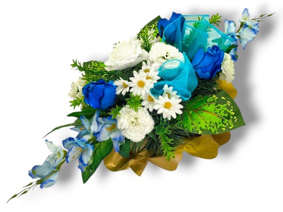 BIAŁO NIEBIESKI STROIK NA CMENTARZ KWIATY NA GRÓB POMNIK MISA Z OBCIĄŻENIEM