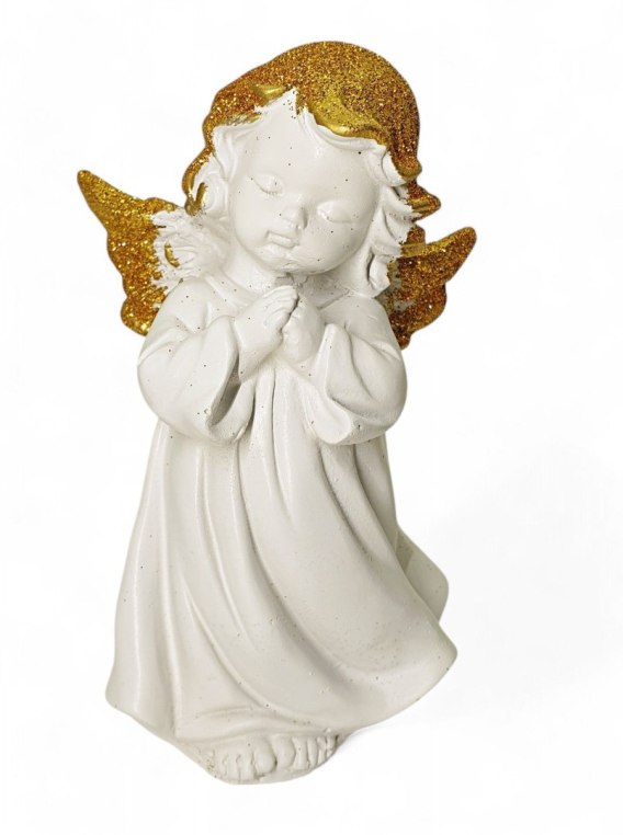 Biała figurka anioła ze złotym brokatem na włosach i skrzydłach o eleganckim wykończeniu, przedstawiająca postać w modlitewnej pozie z zamkniętymi oczami. Wykonana z gipsu, z subtelnymi detalami na skrzydłach i szacie, idealna jako dekoracja do wnętrz lub prezent o symbolicznym znaczeniu. Wysoka jakość wykonania nadaje jej wyjątkowego uroku.