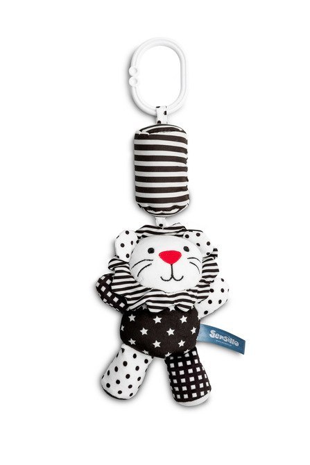 Pluszowa zawieszka do wózka Black&White przykuwa uwagę dziecka nie tylko charakterystycznym czarnobiałym kolorem, ale również przyjemnym dla ucha dzwoneczkiem. Maskotka posiada uniwersalny uchwyt, który pozwala na zamocowanie w dowolnym miejscu, w domu lub podróży. Dodatkowymi atrakcjami dla maluszka są szeleszczące uszy oraz piszczek schowany w brzuszku.