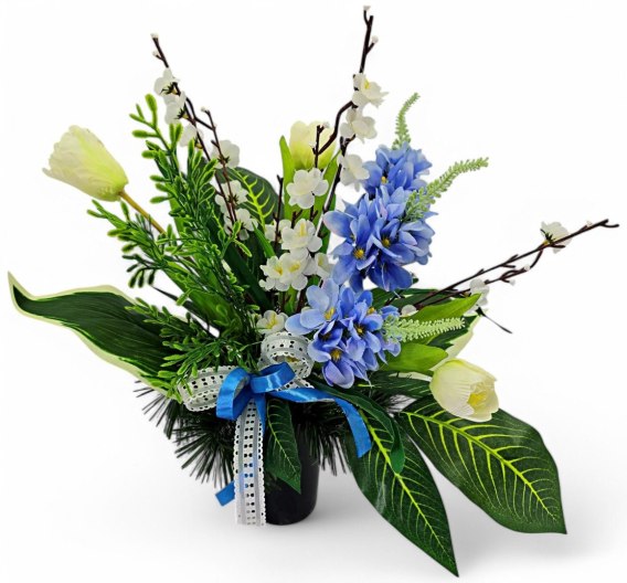 Kompozycje nagrobne z obciążeniem z wysokiej jakości sztucznych kwiatów i roślin.
