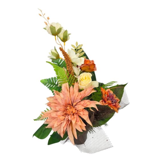 Stroik cechuje się unikalną kompozycją sztucznych kwiatów. Starannie dobrane kwiaty są niezwykle realistyczne, dodając wiązance autentyczności i podkreślając jej uroczysty charakter.
