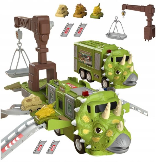 Ciężarówka dinozaur triceratops tir laweta otwierana dźwig plus trzy auta dinozaury