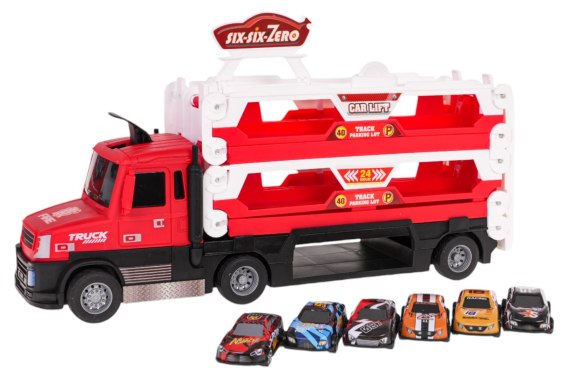 Interaktywny, trzypoziomowy truck z katapultą dla dzieci od 3-go roku życia. Truck posiada kółka z gumowymi oponami, dzięki czemu idealnie trzyma się podłoża. Zabawka posiada trzy poziomy, na których można przechowywać dużą ilość resoraków (w zestawie znajduje się sześć autek z metalową karoserią). Po rozłożeniu poziomów powstaje duży tor, dla autek, o długości aż 140 cm. Truck posiada katapultę dla pojazdów, wystarczy umieścić pojazd na najniższym poziomie i wcisnąć dźwignię znajdującą się na dachu trucka. Samochodzik wystrzeli do przodu i pojedzie po rozkładanym torze. Zabawka zasilana jest bateriami typu 2 x AA 1,5V (brak w zestawie). Po naciśnięciu na przód ciężarówki uruchamiają się efekty dźwiękowe, odgłos pracy silnika i hamowania oraz efekty świetlne w postaci mrugających przednich świateł.