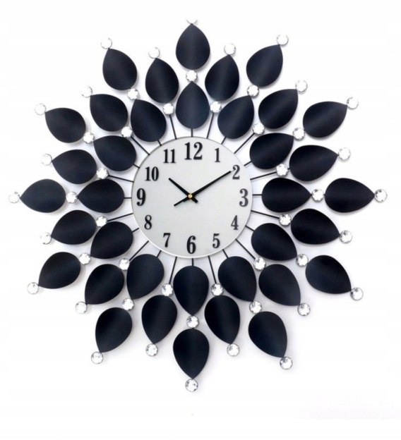 Efektownie i elegancko prezentuje się na ścianie. Szklana tarcza zegara otoczona jest czarnymi metalowymi liśćmi ozdobionymi błyszczącymi kryształkami.