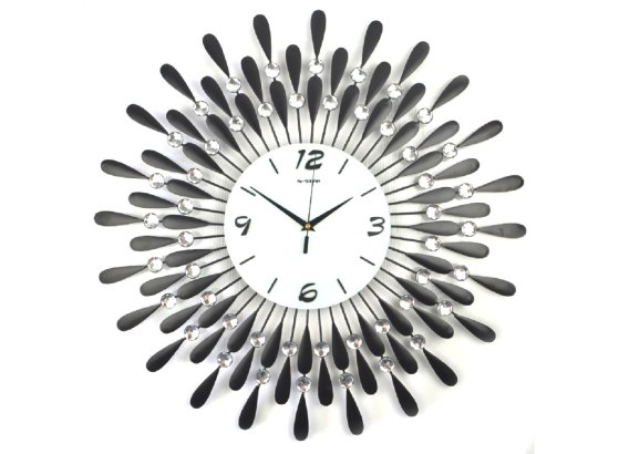 Efektownie i elegancko prezentuje się na ścianie. Szklana tarcza zegara otoczona jest czarnymi metalowymi łezkami ozdobionymi błyszczącymi kryształkami.