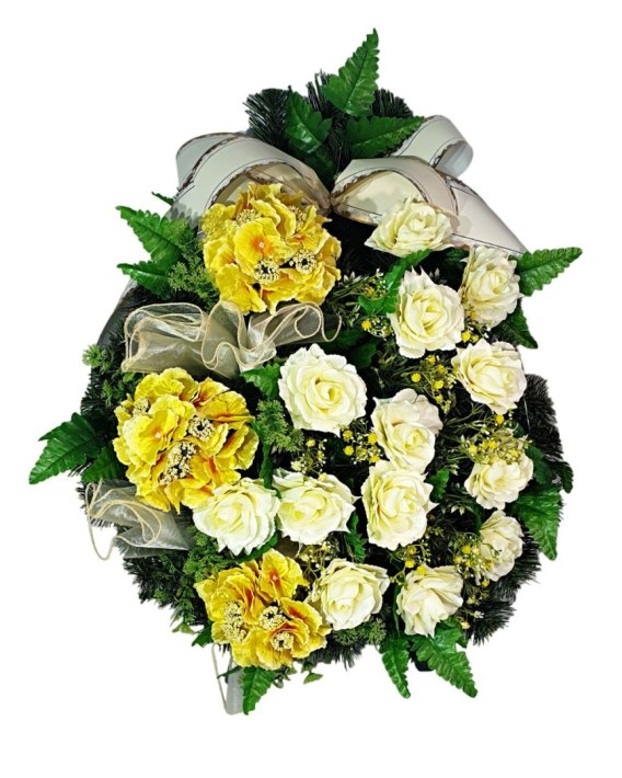Kwiaty są integralnym elementem ceremonii ostatniego pożegnania lub jako element ozdobienia grobu, łącząc szacunek i elegancję w jednym, starannie wykonanym projekcie. Podkład wieńca jest wykonany z zielonych, gęsto splecionych gałązek PCV, które są zarówno trwałe, jak i estetyczne, podkreślając kolorystykę wiązanki.