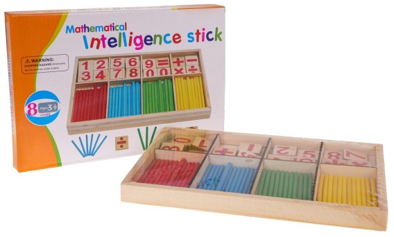 Zestaw drewnianych patyczków do liczenia i klocków dla dzieci powyżej 3-go roku życia. Zestaw składa się z drewnianej podstawki z przegródkami, w których znajdują się patyczki oraz klocki z namalowanymi działaniami matematycznymi i cyframi. Dziecko układa odpowiednie elementy i za pomocą patyczków liczy lub uzupełnia wyniki działań. Z tym zestawem można dodawać, odejmować, mnożyć, dzielić. Drewniane wykonanie zapewnia zestawowi trwałość i wytrzymałość.