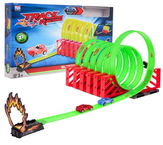 Ekstremalny tor wyścigowy z sześcioma pętlami i autkami w zestawie to propozycja dla dzieci od 3-go roku życia. Zestaw składa się z 27 elementów. Całkowita długość toru to 185 cm. Na torze znajdują się odcinki proste, pętle oraz wyrzutnia z pętlą „ognia". Samochodziki posiadają napęd Pull Back, nie wymagają użycia baterii, by jechać. Wystarczy popchnąć delikatnie samochodzik do tyłu, a pomknie do przodu. Pojazd ustawiamy na starcie, po rozpędzeniu go najpierw mknie odcinkiem prostym, potem pokonuje 6 pętli z obrotem 360 stopni, wjeżdża na odcinek prosty, by przefrunąć przez pętle „płomieni". Autka skonstruowane są z dwóch ruchomych członów, dzięki czemu idealnie dopasowują się do kształtu toru i nie wypadają z niego. Dobra zabawa gwarantowana.