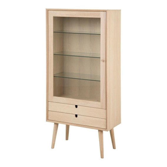 Gablota Century z bielonego dębu to nieodzowny mebel biura lub gabinetu. Pojemna gablota została zrobiona z bielonego dębu oraz szkła. Szafka ze szklanym frontem kryje w sobie trzy szklane półki. Pod szafką umieszczone zostały dodatkowo dwie szuflady z frontem z drewna dębu. Fronty mają delikatne wcięcia, które pełnią funkcję uchwytu do otwierania szuflad. Podstawą gabloty są cztery dębowe nogi w kształcie odwróconych stożków. Waga: 43 kg. Wymiary kartonu: 128cm x 81cm x 44cm