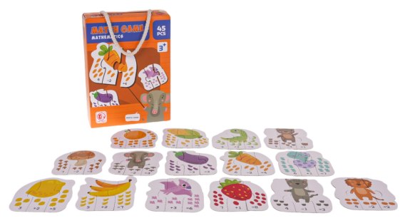 Gra edukacyjna, matematyczna Działania dla dzieci od 3-go roku życia. Gra składa się z 45 puzzli, dzięki którym dziecko uczy się liczyć w zakresie 1-9 i dopasowywać kształty. Gra trenuje również koordynację ręka-oko, rozwija spostrzegawczość i koncentrację. Każda z plansz, składa się z trzech puzzli, na których znajduje się obrazek (warzywa, owoce, zwierzęta) i działania matematyczne, takie jak dodawanie i odejmowanie.