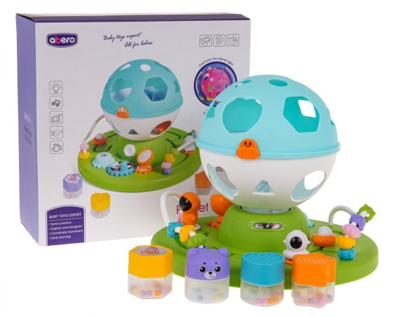 Interaktywny, edukacyjny, sorter o tematyce kosmosu dla maluszków od 18-go miesiąca życia. Sorter wykonany został z najlepszej jakości plastiku w żywych kolorach, przyciągających wzrok maluszka. Zabawka składa się z podstawki, na której znajdują się kółeczka zębate do kręcenia, labirynty do pokonania i przekładanki. Na podstawce jest również okrągły sorter z otworami w kształcie figur geometrycznych. Maluszek musi przypasować klocuszki znajdujące się w zestawie do odpowiednich kształtów na sorterze. Po dopasowaniu wszystkich klocków sorter można otworzyć i zabawę rozpocząć na nowo. W zestawie znajdują się 4 klocuszki. Dodatkowo każdy z nich w środku posiada małe kuleczki, które sprawiają, że klocuszek grzechocze. Sorter posiada również funkcję światła i dźwięku, z wnętrza kuli wydobywa się gwiezdny blask i słychać melodie. Zabawa tym sorterem uczy maluszka dopasowywać i kategoryzować według kształtu i koloru. Poprawia zdolności poznawcze i motoryczne. Dziecko poznaje przyczynę i skutek oraz doskonali umiejętności rozwiązywania problemu. Zabawka zasilana jest bateriami typu 3 x AA 1,5 V (brak w zestawie).