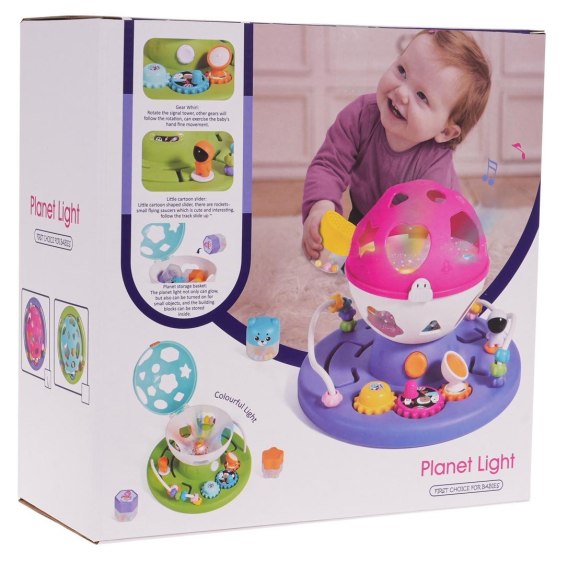 Interaktywny, edukacyjny, sorter o tematyce kosmosu dla maluszków od 18-go miesiąca życia. Sorter wykonany został z najlepszej jakości plastiku w żywych kolorach, przyciągających wzrok maluszka. Zabawka składa się z podstawki, na której znajdują się kółeczka zębate do kręcenia, labirynty do pokonania i przekładanki. Na podstawce jest również okrągły sorter z otworami w kształcie figur geometrycznych. Maluszek musi przypasować klocuszki znajdujące się w zestawie do odpowiednich kształtów na sorterze. Po dopasowaniu wszystkich klocków sorter można otworzyć i zabawę rozpocząć na nowo. W zestawie znajdują się 4 klocuszki. Dodatkowo każdy z nich w środku posiada małe kuleczki, które sprawiają, że klocuszek grzechocze. Sorter posiada również funkcję światła i dźwięku, z wnętrza kuli wydobywa się gwiezdny blask i słychać melodie. Zabawa tym sorterem uczy maluszka dopasowywać i kategoryzować według kształtu i koloru. Poprawia zdolności poznawcze i motoryczne. Dziecko poznaje przyczynę i skutek oraz doskonali umiejętności rozwiązywania problemu. Zabawka zasilana jest bateriami typu 3 x AA 1,5 V (brak w zestawie).