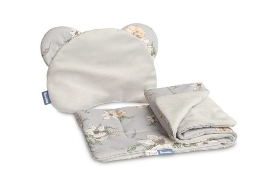 W skład kompletu wchodzi śliczna poduszka z uszami misia oraz kołderka z delikatnym wypełnieniem włókniną silikonową. Dwustronny komplet jest wykonany z wysokiej jakości materiałów - kolorowej bawełny oraz bardzo przyjemnej tkaniny velvet, która utuli każdego bobasa. Komplet idealnie sprawdza się w wózku, łóżeczku, kołysce czy jako mata dla maluszka. Sama poduszka może służyć jako przytulanka. Wysoką jakość wykonania podkreśla estetyczna wypustka