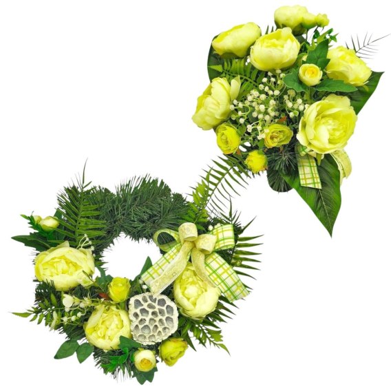 Ten komplet został przygotowany z myślą o spójnej i eleganckiej dekoracji nagrobka. Wianek i bukiet tworzą harmonijną całość, która w piękny sposób podkreśli pamięć o bliskich, zapewniając uroczysty i zadbany wygląd pomnika.