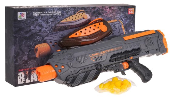 Karabin półautomatyczny na kulki dla dzieci od 14-go roku życia. Karabin został znakomicie wykonany z najlepszej jakości plastiku. Posiada na górze magazynek z kulkami. Instrukcja użycia karabinu jest prosta, wystarczy namierzyć cel i wystrzelić. W zestawie znajdują się 20 kulek. Kulki są gumowe, bezpieczne. Karabin zasilany jest bateriami typu 6 x AA 1,5 V (brak w zestawie).