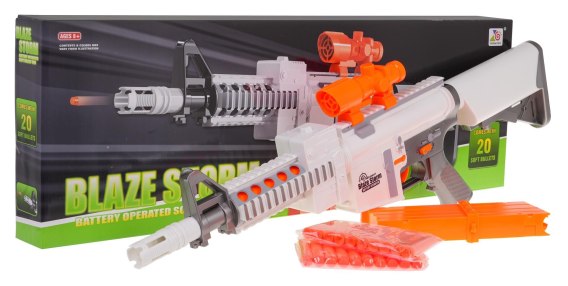 Półautomatyczny karabin na pociski dla dzieci od 8-go roku życia. Pistolet wyposażono w duży wysuwany magazynek, mieszczący 10 pocisków i celownik. Użycie karabinu jest bardzo proste, wystarczy namierzyć cel, naładować i przycisnąć spust. Pocisk poszybuje na odległość ok. 15 metrów. Karabin zasilany jest bateriami typu 5 x AA 1,5 V (brak w zestawie).