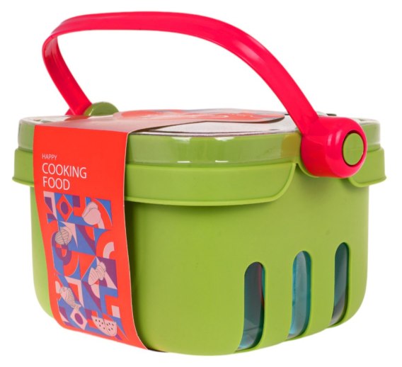 Koszyk z akcesoriami dla dzieci od 3-go roku życia. W zestawie znajduje się koszyk piknikowy, garnek z pokrywką, deska do krojenia warzyw i owoców, nóż, patelnia, talerzyki, kubki oraz atrapy warzyw i owoców na rzepy. Idealny sposób na zabawę na zewnątrz.