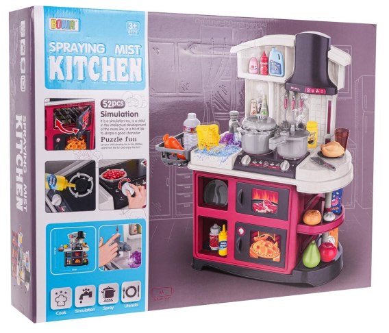 Interaktywna kuchnia z funkcją światła, dźwięku i kranikiem, z którego wydobywa się woda, a także mnóstwem akcesoriów, dla dzieci od 3-go roku życia. Kuchnia została znakomicie wykonana, z najlepszej jakości plastiku i jest w żywych kolorach zachęcających dziecko do zabawy. Na blacie kuchni znajduje się interaktywna płyta z palnikami. Po przekręceniu jednego z pokręteł słychać odgłosy gotowania, a drugiego, odgłos smażenia, któremu towarzyszy podświetlenie palników. Po dodaniu paru kropelek wody na palnik wydobywa się z niego zimna para wodna. Z kranu faktycznie wypływa woda, jak w prawdziwym zlewie, dziecko będzie mogło umyć zabawkowe naczynia. W zestawie mamy też atrapę piekarnika z otwieranymi drzwiczkami i atrapę grilla z otwieranymi drzwiczkami oraz mnóstwo półeczek, na których ułożyć możemy atrapy produktów. Cały zestaw prezentuje się znakomicie. Zabawka zasilana jest bateriami typu 3 x AA 1,5 V (brak w zestawie).