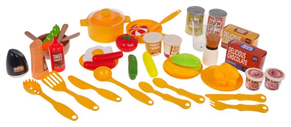 - atrapy produktów spożywczych: papryka, pomidor, liść sałaty, plasterek marchwi, plasterek papryki, krewetka, jajko sadzone, parówki, banan, groszek zielony, ogórek.