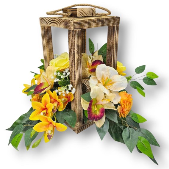 Dodaj wyjątkowy akcent do miejsca pamięci dzięki tej pięknej kompozycji w drewnianym lampionie. Stroik zachwyca żywymi kolorami i starannym wykonaniem - symbolizując pamięć oraz szacunek.