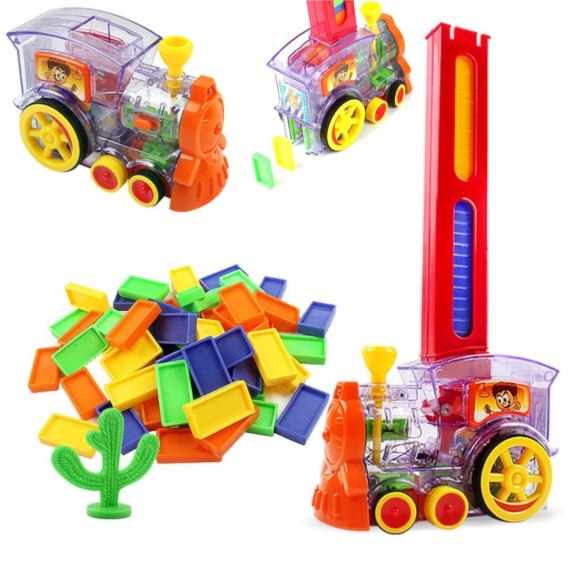 Automatyczna lokomotywa domino jeżdżąc układa klocuszki w odpowiednich odległościach. Wystarczy wypełnić podajnik klockami i włączyć lokomotywę. Lokomotywa może jechać do przodu, w lewo bądź prawo. Kierunek jazdy sterowany jest poprzez przekręcenie komina, dzięki temu kształt trasy może być różny na przykład ślimaki, okręgi i ślaczki.