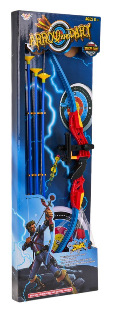 Zestaw łuk, bełty, tarcza, rzutki dla dzieci od 3-go roku życia. Łuk jest bardzo prosty w użyciu, wystarczy umieścić strzałę pomiędzy celownikiem a cięciwą, namierzyć cel i oddać strzał. W zestawie znajdują się również rzutki z przyssawką, którymi można również rzucać do celu. Tarcza z celem posiada gumową przyssawkę. Zabawa zestawem uczy precyzji i skupienia, jest to również świetny trening mięśni barków i pleców