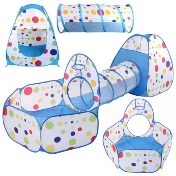 Zestaw 3w1 zawiera namiot w kształcie domku, który posiada wejście mocowane na sznurek aby pozostało otwarte i zapewniające jednocześnie przepływ powietrza. Z jednej ze ścianek znajduje się okrąg na włożenie i przymocowanie tunelu, który można połączyć z basenikiem który posiada zamocowany kosz do piłeczek.