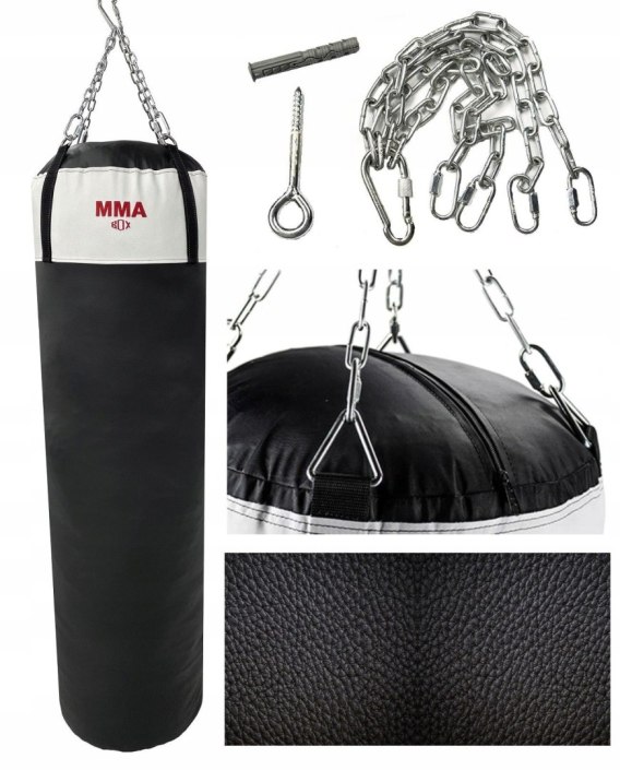 Worek pełny, gotowy do zawieszenia. Bardzo wytrzymały w zestawie z mocowniem oraz wypełnieniem. Wszystkie szwy są podwójne. Posiada metalowe mocowania. Pas wzmacniający wszyty w górnej części worka. Szwy wykonane nicami rdzeniowymi. Najwyższej jakości taśmy nośne. Worek zamykany zamkiem błyskawicznym, jest to lepsze i wygodniejsze rozwiązanie niż stosowane wiązania. KONSTRUKCJA: Struktura worka wykonana z wytrzymałej i elastycznej skóry ekologicznej. Skóra wytrzymała, odporna na ciosy i zabrudzenia. Szwy wykonane nićmi RDZENIOWYMI. Nici rdzeniowe przeznaczone są do kaletnictwa, składają się z rdzenia oplecionymi włóknami (poliester rdzeniowy). Dzięki temu szwy charakteryzują się jakością i wytrzymałością, a zaszyta w ten sposób skóra zachowa swoją strukturę przez wiele lat. Górna część worka wzmocniona pasem usztywniającym i najwyższej jakości taśmami nośnymi. Pas wzmacniający wszyty w górnej części worka ma na celu podtrzymywanie pasów nośnych, do których przymocowane są metalowe łańcuchy (dołączone do zestawu). Worek zamykany zamkiem błyskawicznym, rozwiązanie to jest dużo lepsze i wygodniejsze niż wiązania. WYPEŁNIENIE: Worek treningowy wypełniony ścinkami bawełny, poliestru, polaru i filcu. Mieszanka idealna dla worków treningowych. Dla zachowania dobrych właściwości treningowych (miękkość worka, odpowiedni ciężar) nie zaleca się wypełniania ze ścinków materiałowych, piasku lub innych ciężkich i twardych tworzyw. Wypełnienie worka musi dobrze amortyzować ciosy, nie może "schodzić na dno worka", nie może być zanadto upchane ani zbyt ciężkie.