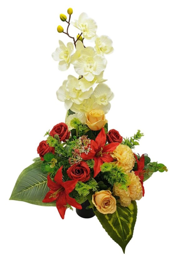 Kompozycje nagrobne z obciążeniem z wysokiej jakości sztucznych kwiatów i roślin.