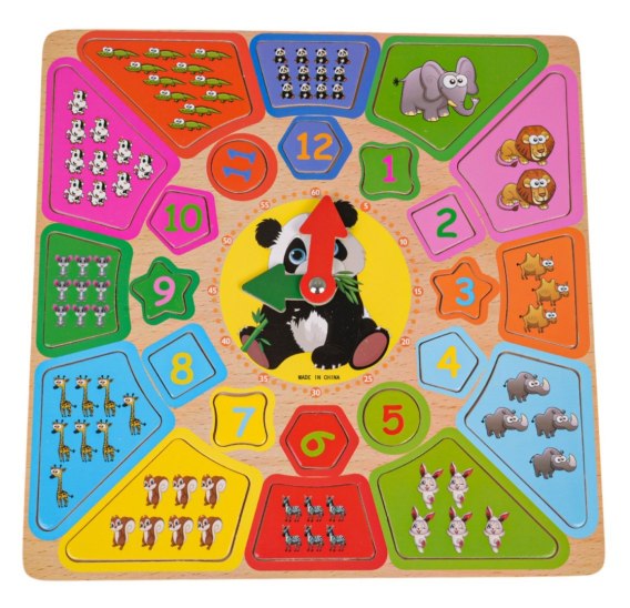 Edukacyjny zestaw do nauki czasu, liczenia i przyporządkowania kształtów. Zestaw składa się z kolorowej planszy, na której w centralnej części znajduje się zegar z ruchomymi wskazówkami. Dalej mamy sorter kształtów z cyframi arabskimi od 1 do 12 oraz sorter  kształtów z rysunkami zwierzątek. Dziecko ustawia konkretną godzinę na zegarze, przyporządkowuje konkretną cyfrę arabską do tej godziny oraz konkretną ilość zwierzątek. Cały zestaw wykonany został z drewna, pomalowany nietoksycznymi farbami w żywych kolorach.