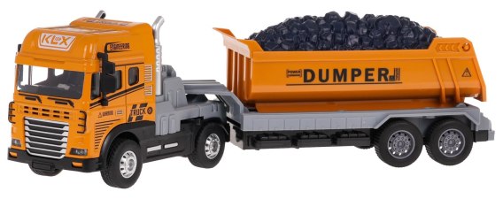 Interaktywna wywrotka dla dzieci od 3-go roku życia. Wywrotka wykonana została w skali 1:24, posiada metalową, wytrzymał kabinę i skrętną przyczepę wykonaną z najlepszej jakości plastiku. Przyczepę możemy odczepiać, manualnie podnosić, opuszczać, ruchoma jest również tylna klapa przyczepy. Pojazd posiada mrugające przednie lampy oraz funkcje dźwiękowe: odgłos jazdy pojazdu, klakson, odgłos cofania. Koła w pojeździe posiadają gumowe bieżniki i napęd na tył. Zabawka zasilana jest bateriami typu 3 x AG3 (w zestawie).