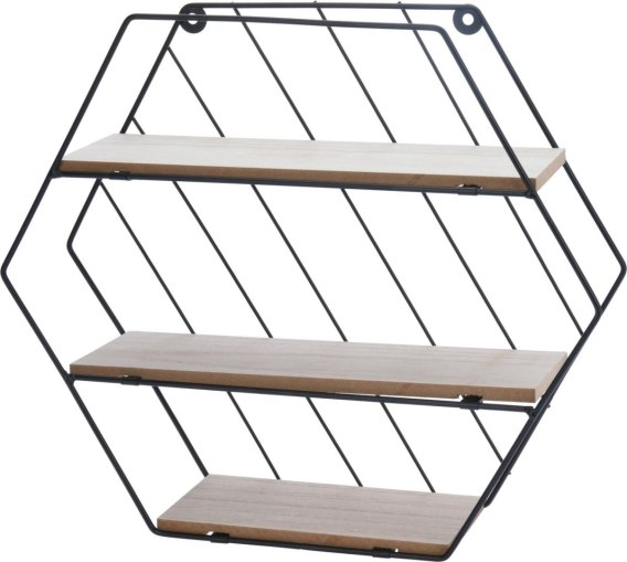Półka ścienna w kształcie heksagonu pozwoli na zagospodarowanie nawet najmniejszej przestrzeni na ścianie. Półka wykonana została z metalu pomalowanego proszko na czarno oraz trzech prostokątnych półek wykonanych z MDF. Maksymalne obciążnie całej półki to 4kg. Wymiary opakowania: 44x32x3,5cm Półka wymaga montażu.
