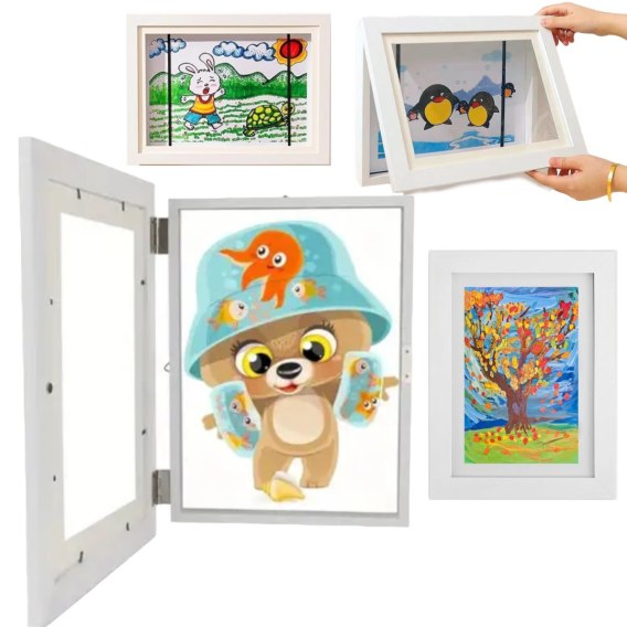- Otwierana ramka, do której można wkładać prace dzieci, zapobiegając zakurzeniu się