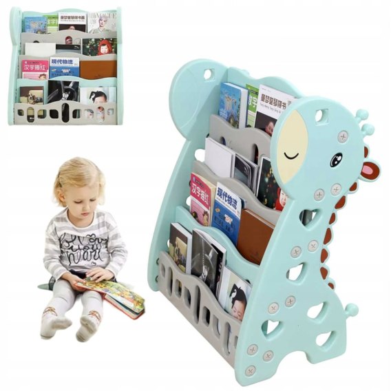 - przyjazny wygląd: Regał jest dostępny w zielonym kolorze z szarymi pólkami oraz z pięknym wzorze żyrafki który przyciągnie uwagę dzieci. Dzięki temu staje się atrakcyjnym elementem dekoracyjnym pokoju.