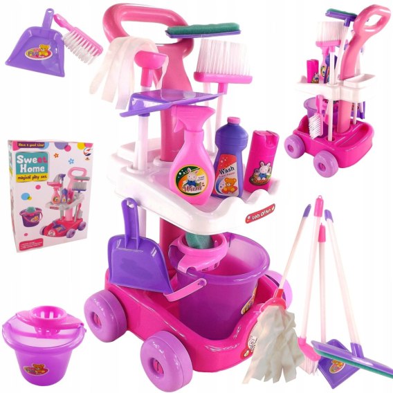 Elementami zestawu do sprzątania są: szufelka, szczotka, wiadro z mopem oraz inne artykuły - są one świetnym odwzorowaniem prawdziwych akcesoriów do sprzątana, które zaciekawią Twoją pociechę. Dołączony wózek pozwala na utrzymanie wszystkich niezbędnych elementów w jednym miejscu co ułatwia utrzymanie ładu i porządku. Wózek posiada wygodną rączkę przeznaczoną do pchania lub ciągnięcia. Komplet posiada gąbkę i kolorowe buteleczki z detergentami, które są imitacjami prawdziwych płynów do mycia.