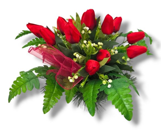 Kompozycje nagrobne z wysokiej jakości sztucznych kwiatów i roślin.