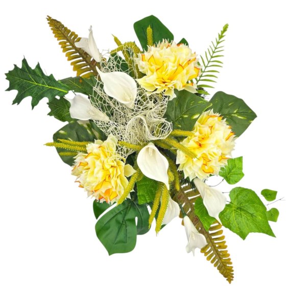 Kompozycje nagrobne z wysokiej jakości sztucznych kwiatów i roślin.