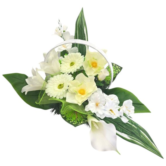 Kompozycje nagrobne z wysokiej jakości sztucznych kwiatów i roślin.
