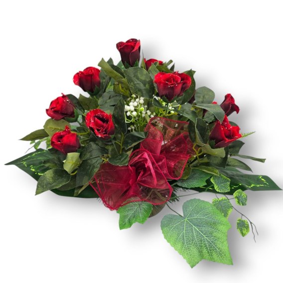 Kompozycje nagrobne z wysokiej jakości sztucznych kwiatów i roślin.