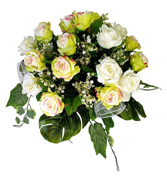 Kompozycje nagrobne z obciążeniem z wysokiej jakości sztucznych kwiatów i roślin.