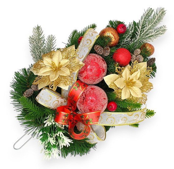 Przedstawiamy przepiękny Stroik Świąteczny - wyjątkową dekorację bożonarodzeniową, która wprowadzi świąteczną atmosferę w każdą przestrzeń! Wykonany z realistycznego igliwia, zdobiony eleganckimi bombkami, naturalnymi szyszkami, złotą kokardą oraz kwiatem gwiazdy betlejemskiej w złotym blasku. Całość uzupełniają starannie dobrane dodatki, które nadają stroikowi niepowtarzalnego uroku.