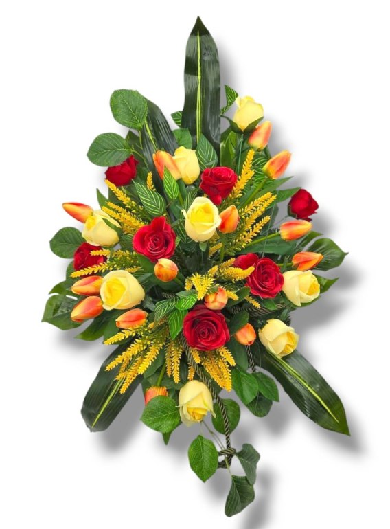 Kompozycje nagrobne z wysokiej jakości sztucznych kwiatów i roślin.