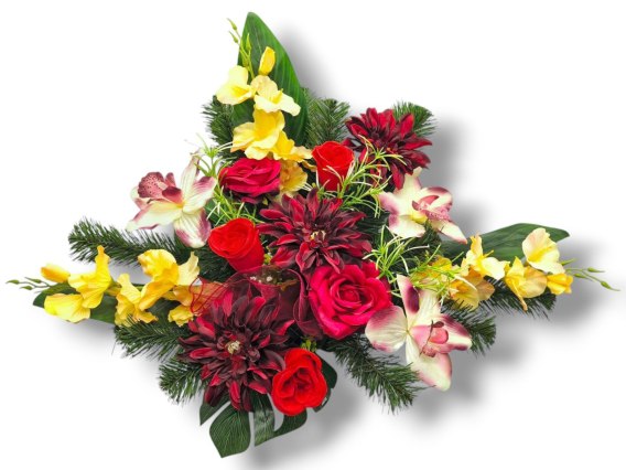 Kompozycje nagrobne z wysokiej jakości sztucznych kwiatów i roślin.