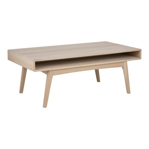 Stolik kawowy Marte to kolejny mebel z serii Marte. Seria ta charakteryzuje się wyjątkowo solidnymi meblami z forniru dębowego. Dodatkowo meble są bielone, co dodaje im stylu. Stolik o nieoczywistym kształcie jest olejowany, dzięki czemu uwydatniona została naturalna struktura drewna. Dzięki swojej nietypowej budowie została wygospodarowana dodatkowa półka na drobne przedmioty. Podstawą stolika są drewniane lekko rozchodzące się na boki nogi. Waga: 28,12 kg. Wymiary kartonu: 142cm x 81cm x 23,5cm