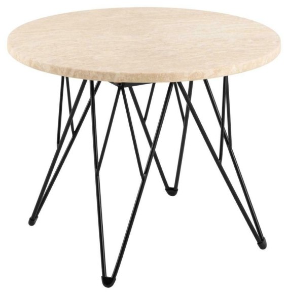 Okrągły stolik boczny Prunus, blat z matowego trawertynu lakierowanego na beżowo, podstawa z drutu ze stali malowanej proszkowo na czarno. Ten stolik boczny spodoba się zarówno minimalistom, jak i maksymalistom. Wyróżnia się efektownym blatem z trawertynu, wspartym na chromowanej drucianej podstawie. Wyważony kontrast między proporcjami nadaje projektowi lekkiego uroku. Z łatwością dopasuje się do każdego stylu wnętrza. Waga stolika: 14,4kg. Max. obciążenie 20 kg Wymiary kartonów: 14x66x77cm i 59,5x31x11cm