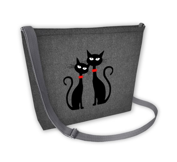 Torba marki Bertoni model SAMBA  wzór Czarne koty Wykonana z bardzo wytrzymałej odpornej na przetarcia tkaniny - Codury. Dodatkowa impregnacja sprawia, że torba jest całkowicie odporna na warunki atmosferyczne. Torba w typie listonoszki, zapinana na zamek błyskawiczny. Wewnątrz starannie wykończona filcem dzięki czemu jest sztywniejsza. W środku podręczna podwójna kieszonka. Długi, regulowany pasek pozwoli dopasować torbę do naszych potrzeb.