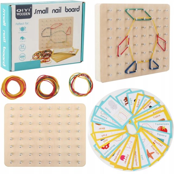 Zabawka gra edukacyjna kreatywna tablica do układania gumkami, połączona z nauką figur geometrycznych, kolorów czy liczenia.