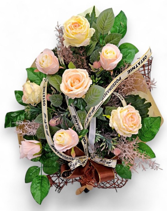 Kwiaty są integralnym elementem ceremonii ostatniego pożegnania lub jako element ozdobienia grobu, łącząc szacunek i elegancję w jednym, starannie wykonanym projekcie. Podkład wieńca jest wykonany z zielonych, gęsto splecionych gałązek PCV, które są zarówno trwałe, jak i estetyczne, podkreślając kolorystykę wiązanki.