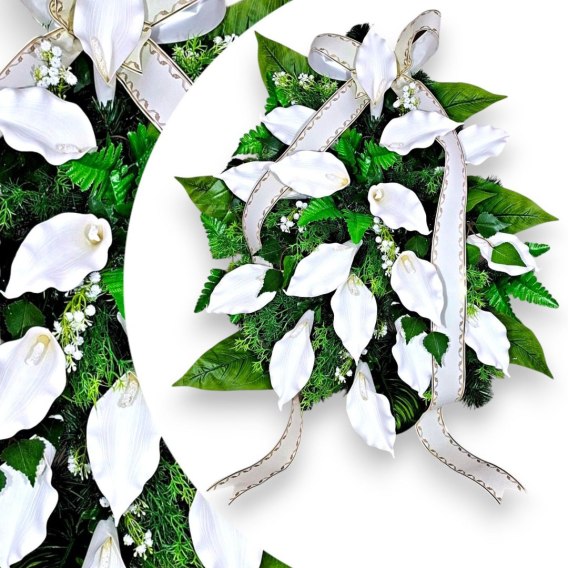 Wieniec cechuje gęsty splot sztucznych gałązek iglastych, które tworzą estetycznie wyglądające tło dla unikalnej kompozycji kwiatów. Starannie dobrane kwiaty są niezwykle realistyczne i naturalne, dodając wiązance autentyczności i podkreślając jej uroczysty charakter.